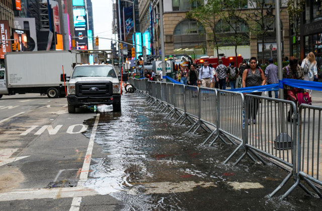 127 yıllık su şebekesinin patlaması sokakların ve kalabalık Times Meydanı metro istasyonunun sular altında kalmasına neden oldu.