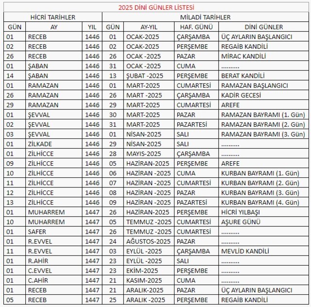 2025 DİNİ GÜNLER TAKVİMİ