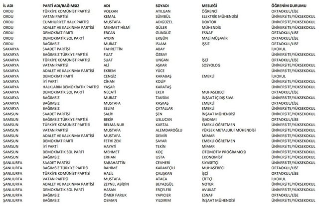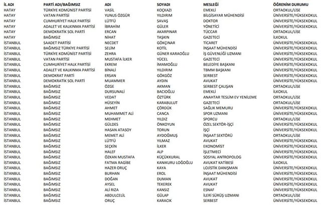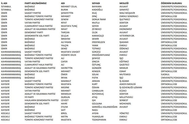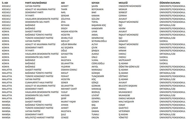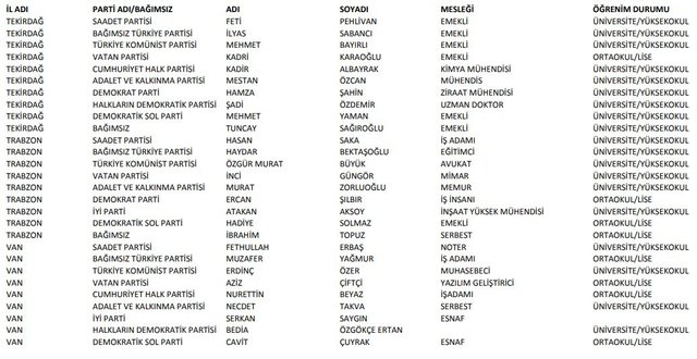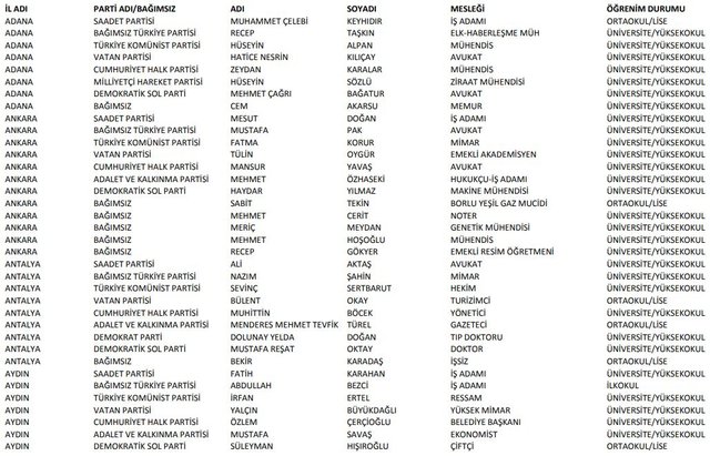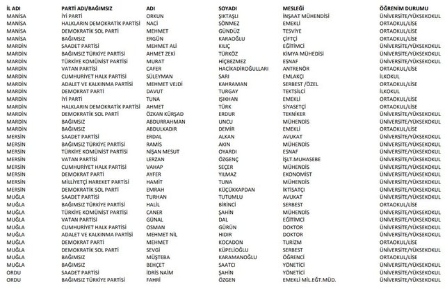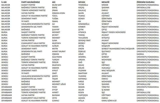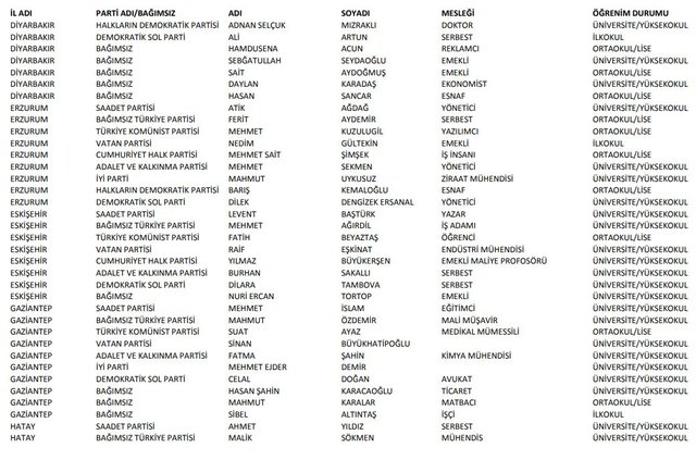 YSK'nın açıkladığı Büyükşehir belediye başkan adayları (AK PARTİ, CHP, MHP, İYİ PARTİ HDP, SAADET PARTİSİ) şöyle: