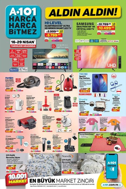 A101 aktüel ürünler kataloğu yayımlandı. A101'de bu hafta perşembe gününden itibaren satışa sunulacak aktüel ürünler vatandaşlar tarafından araştırılıyor. 21 Nisan 2022 A101 aktüel kataloğunda; Toshiba Ultra HD Smart TV, Reeder P13 Blue Plus Cep Telefonu, Aprilla Çay makinesi, Piranha akıllı bileklik ve pek çok ürün bulunuyor. İşte A101 21 Nisan 2022 kataloğu...