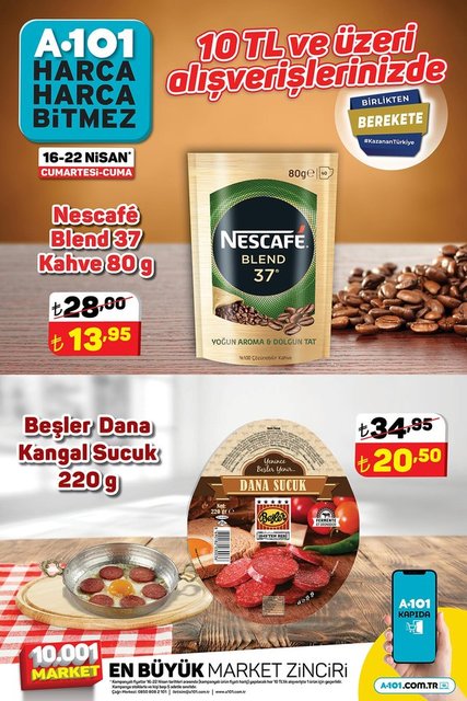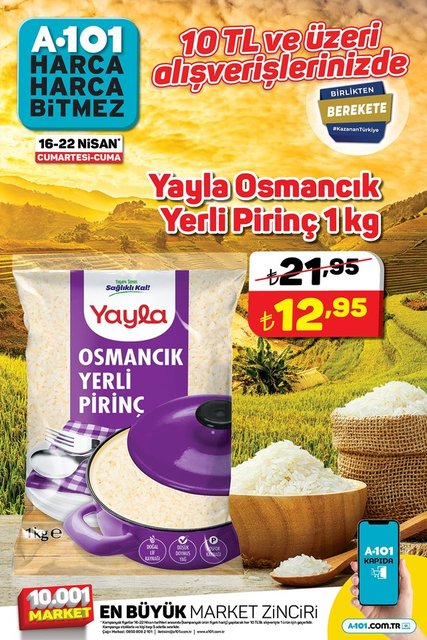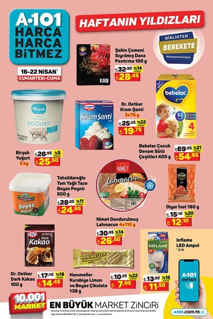 Her hafta olduğu gibi bu hafta da A101 indirimli ürünler listesinde hangi ürünlerin olduğunu araştırıyor. A101 aktüel ürünler 16-22 Nisan kataloğunda; yoğurt, krem şanti, pirinç, dana pastırma, bebek devam sütü, led ampül, leke çıkarıcı, toz deterjan, kahve, kangal sucuk, maskara ve nemlendirici krem gibi birçok ürün indirimli fiyatıyla raflarda yer alacak. İşte, 16-22 Nisan A101 Aktüel ürünler kataloğu...