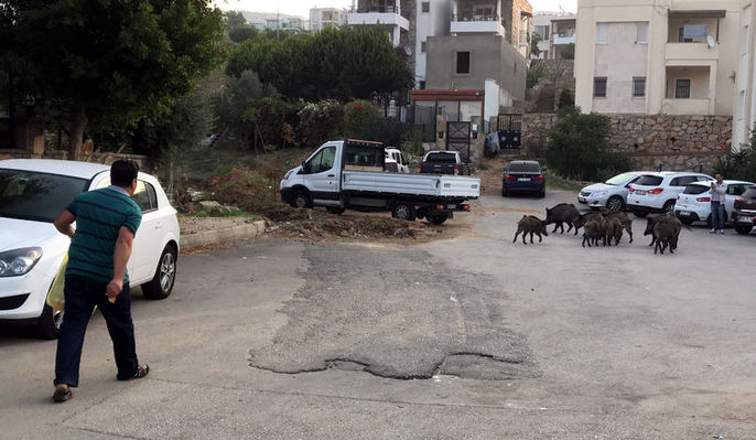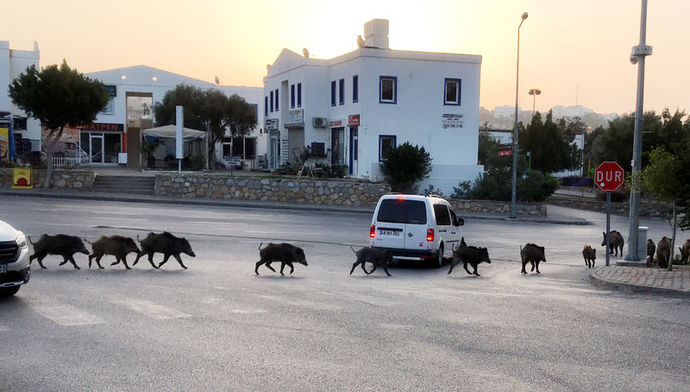 Muğla'nın Bodrum ilçe merkezinde dün sabah saatlerinde sokağa çıkanlar gözlerine inanamadı. Aç kalan 30'a yakın yaban domuzu ilçe merkezinde tur attı. Bazı vatandaşlar korkarken bazıları da domuzlara yiyecek fırlattı