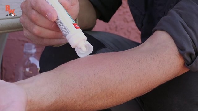 Bölgeyi alkolle steril hale getirdikten sonra enfeksiyonlara karşı kullanılan bir krem sürdü.