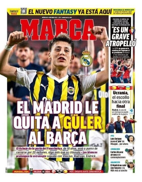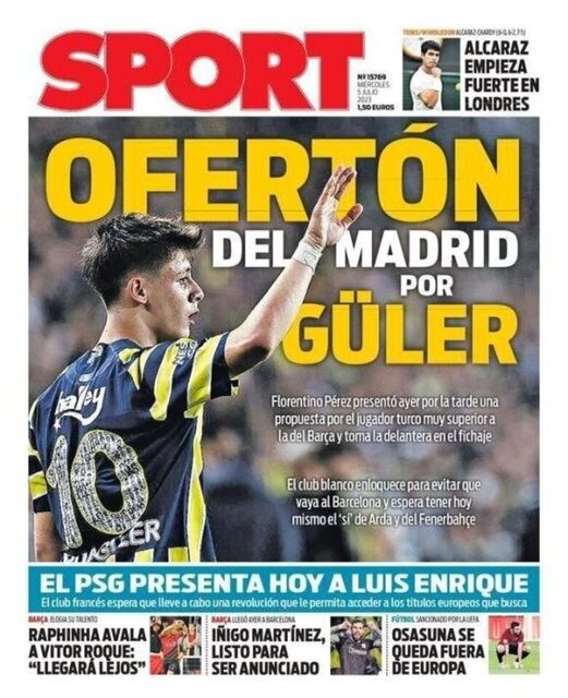 "Florentino Perez, öğleden sonra Türk oyuncu için Barça'nın teklifinden çok daha yüksek bir teklif sundu ve transferde öne geçti. Arda'nın Barcelona'ya gitmesini engellemek için çıldıran Real Madrid, bugün Arda ve Fenerbahçe'nin 'evet' demesini umuyor."