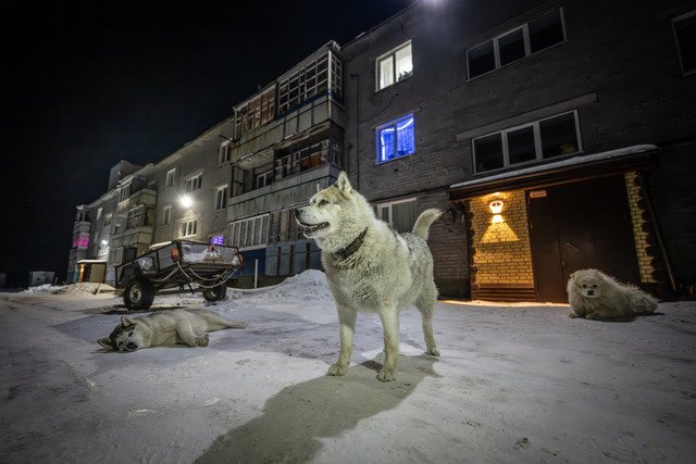 Soğuk iklim koşullarına uyumlu husky cinsi köpekler, köy genelinde sıkça görülürken, Arktik yaşamın günlük görüntülerinden biri olarak dikkati çekiyor.