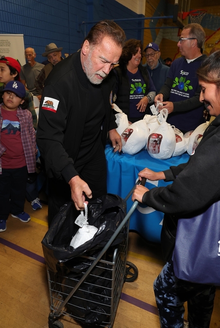 Ünlü oyuncu ve eski California Valisi Arnold Schwarzenegger, ABD'de bugün kutlanacak Şükran Günü öncesinde Los Angeles'ta ailelere hindi dağıtımına katıldı