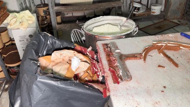Hiçbir hijyen koşuluna uyulmadan merdiven altı üretim yapıldığı belirlenen iş yerinde düğün pastalarının paslı ve kirli aletlerle hazırlandığı, soğutucu olarak hazırlanan dolaplarda hijyen kurallarına uyulmadığı saptandı.