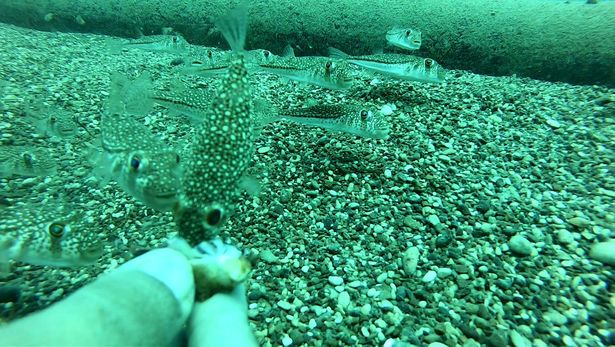 Balon balığı sürüsünü elleriyle besledi