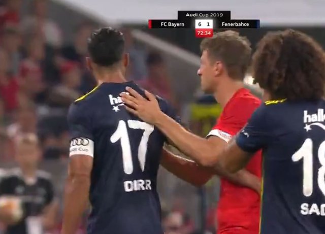 Bayern Münih'in kaptanlarından Thomas Müller de daha sonra Dirar'ın yanına giderek Faslı yıldızı teselli etti.