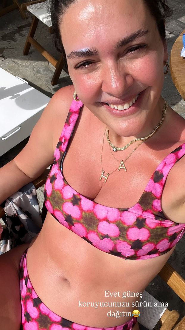 Ünlü oyuncu, yeni paylaşımına; "Aşırı yediğim, feci ve komik bir şekilde yandığım, bebelerimle koyun koyuna erkenden uyuduğum, her akşam dondurma yediğim, yasemin kokularıyla uyandığım bir tatil" notunu düştü.