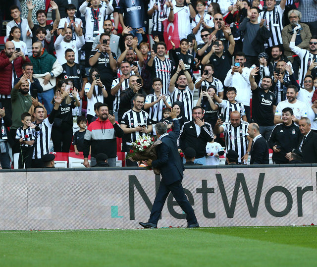 Takımların ısındığı sırada sahaya gelerek tribünleri selamlayan Güneş'e siyah-beyazlı taraftarlar çiçek attı.