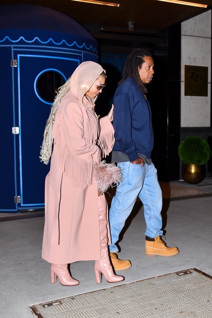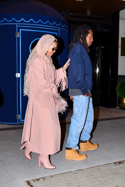 Beyonce, eşiyle dışarıda geçirdikleri gece için açık pembe, kapüşonlu bir kıyafet ve aynı renkte çizmeden oluşan bir kombin seçmişti.