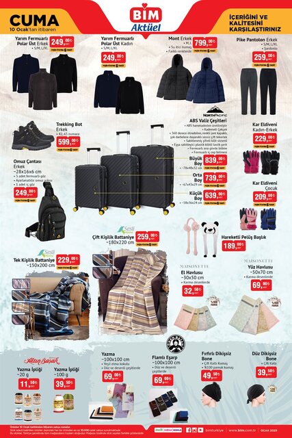 Yeni haftanın BİM aktüel ürünler kataloğu yayınlandı. 10 Ocak'tan itibaren geçerli olacak BİM indirimlerinde balıkçılık malzemeleri, yumak çeşitleri, çıtçıt pense seti, örgü makinesi, valiz çeşitleri, battaniye indirimde olacak. İşte BİM indirimli ürünlerin tamamı