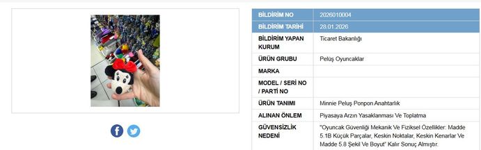 Bu kapsamda, riskli bulunan peluş oyuncağın piyasaya arzı yasaklanırken, satışta olan ürünlerin toplatılmasına karar verildi.