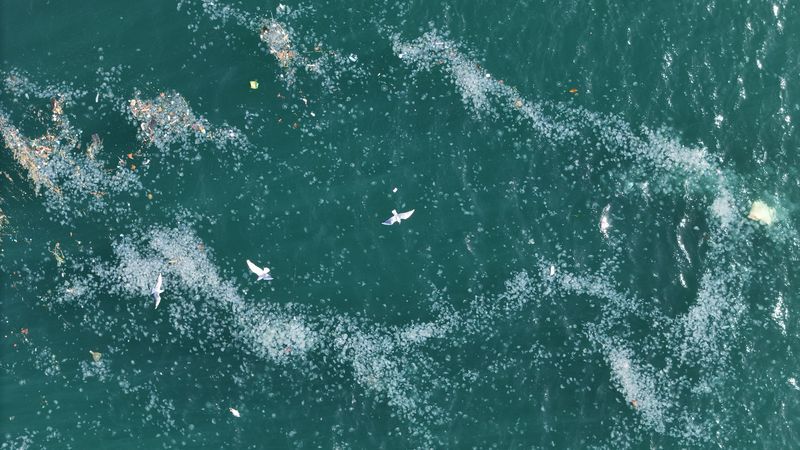 Bu kez Üsküdar’a bağlı Kandilli açıklarında su yüzeyinde yoğun şekilde bir araya gelen denizanaları, çevredeki atıklarla birlikte havadan görüntülendi. Drone kamerasına yansıyan görüntülerde, akıntı hattı boyunca kümelenen deniz analarının yer yer beyaz şeritler oluşturduğu görüldü. Su yüzeyindeki plastik ve çeşitli evsel atıkların da aynı bölgede toplandığı dikkat çekti.