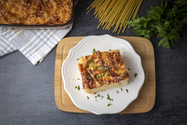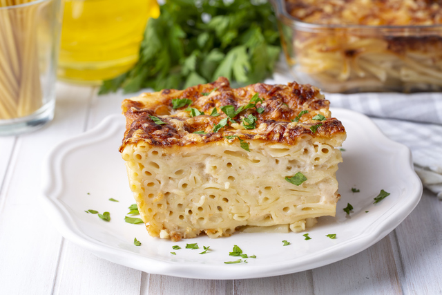 Haşlanmış makarna ile beşamel sosu geniş bir kapta harmanlayın ve yağlanmış fırın kabına dökün.