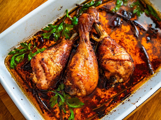 Soslanmış tavuk ve sebzeleri fırın tepsisine dizin, kapta kalan sosu da tepsinin üzerinde gezdirin.