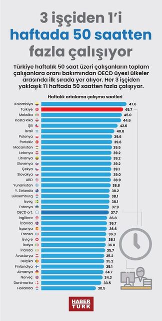 Avrupa İstatistik Ofisi (Eurostat) verilerine göre Avrupa'da haftada ortalama çalışma saatinin en yüksek olduğu ülke Türkiye. 20-64 yaş aralığındaki çalışan kesimin ortalamasını veren bu rakam part-time işleri de kapsıyor. Dolayısıyla tam zamanlı işlerde Türkiye'de çalışma saatleri çeşitli işlerde 49-50 saati bulabiliyor.