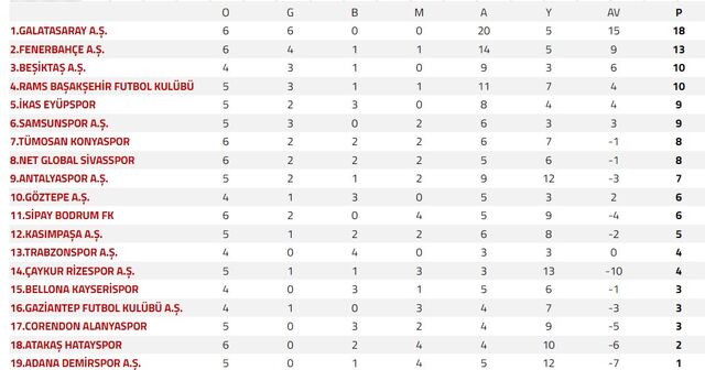 Süper Lig heyecanı 6. hafta maçları ile devam ediyor. Ligin 6. haftası zirve yarışını doğrudan etkileyen bir maça sahne oldu. Fenerbahçe sahasında Galatasaray'ı ağırladı. Kıran kıran mücadelelere sahne olan maçta Galatasaray Fenerbahçe'yi 3-1 mağlup etmeyi başardı . Maçın ardından Süper Lig puan durumu futbolseverlerin gündemini meşgul etmeye başladı. İşte canlı 2024-2025 Süper Lig puan durumu, lig fikstürü ve maç sonuçları...