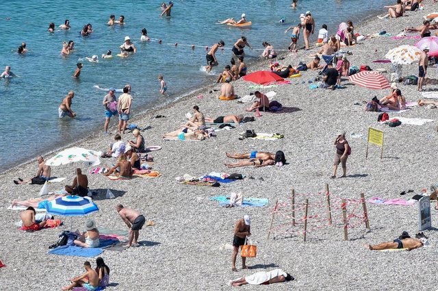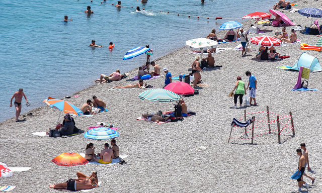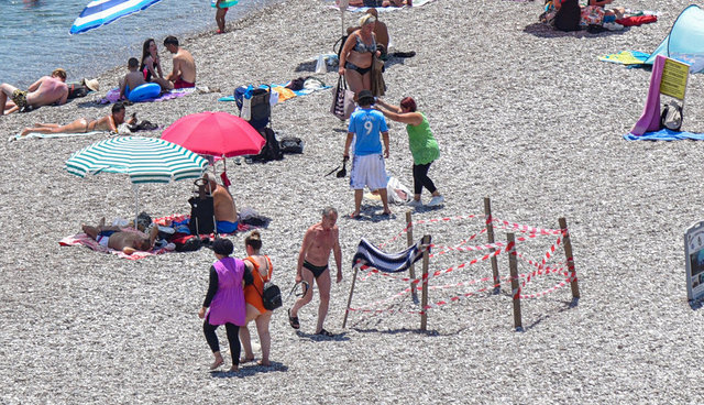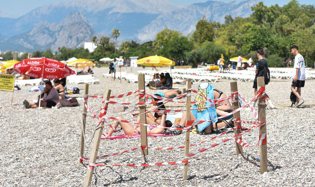Antalya'nın Konyaaltı ilçesi sahilinde deniz kaplumbağası yumurtalarını korumak için tahta kazık ve şeritle çevrilen yuvaya, bazı tatilcilerin ıslak havlu, şort ve mayo astığı görüldü.