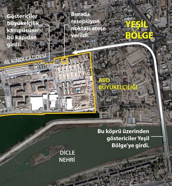 Yüzlerce Iraklı Şii militan ve destekçileri, Bağdat'taki ABD Büyükelçiliği'ne basarak, kampüsün bir kısmını ateşe verdi.