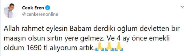Cenk Eren, "Allah rahmet eylesin babam derdi ki oğlum devletten bir maaşın olsun, sırtın yere gelmez. Ve 4 ay önce emekli oldum 1690 TL alıyorum artık" dedi.