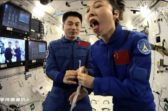 Öğrencilerden gelen soruları yanıtlayan Çinli 2 taykonot, bir öğrencinin "Uzayda su geri dönüşüm sisteminiz var mı?" sorusu üzerine uzayda nasıl su içildiğini gösterdi.