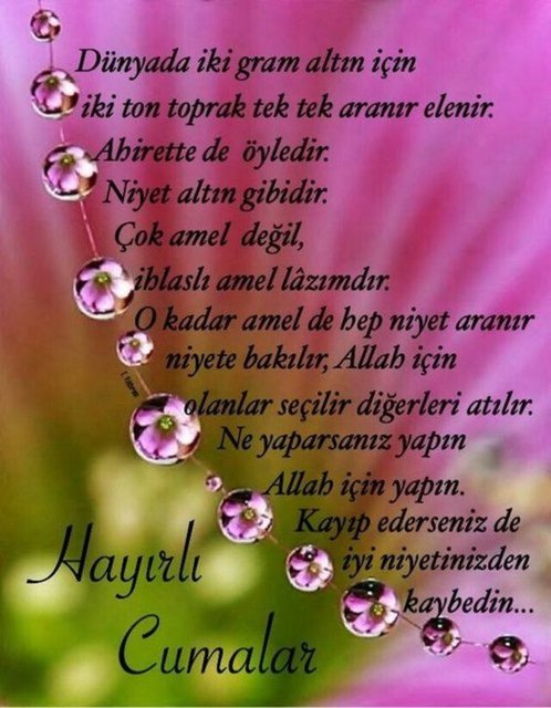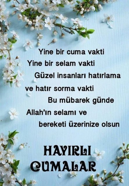 Bugün Cuma, manevi anlamda bir arınma ve yenilenme günüdür. Rabbimizin size merhamet ve bağışlama kapılarını açması dileğiyle, huzurlu ve mutlu bir Cuma geçirmenizi dilerim.
