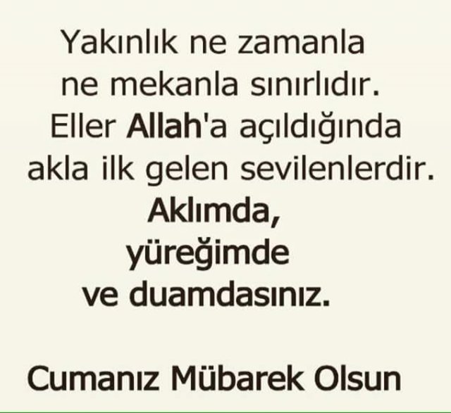 * Bir dua gönderiyorum hepinize, sağlık, mutluluk, huzur olsun, sevdikleriniz yanınızda, dünyanız barış dolsun, Allah'ın selamı üzerinize olsun hayırlı cumalar dilerim.