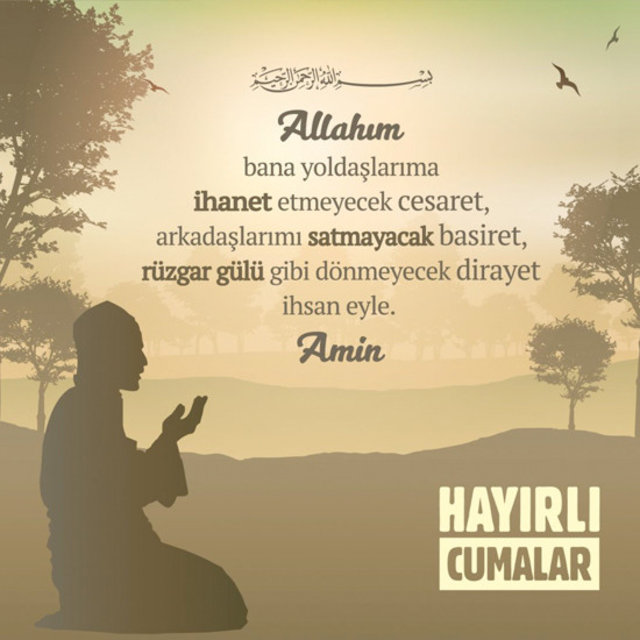 Ey ALLAHIM! Sen ümit edeni ümitsizliğe düşürmezsin. Sen Sen'den isteyeni geri çevirmezsin. Ey ismi Deva, Zikri şifa ve itaati zenginlik olan; sermayesi ümit ve silahı dua olan bu kullarına maddi manevi şifa ol. Sana yönelen kalplerimizi boş çevirme. (Amin) hayırlı cumalar..