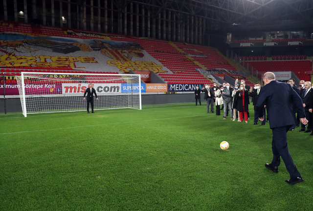 Cumhurbaşkanı Recep Tayyip Erdoğan, bugün video konferans yöntemiyle açılışını yaptığı Göztepe Gürsel Aksel Stadı'na geçerek incelemelerde bulundu. Cumhurbaşkanı Erdoğan burada AK Parti İzmir Milletvekili Alpay Özalan'ın koruduğu kaleye penaltı atışı kullandı. Erdoğan o kareyi sosyal medya hesabından 'Durmak yok gollere devam' başlığı ile paylaştı...