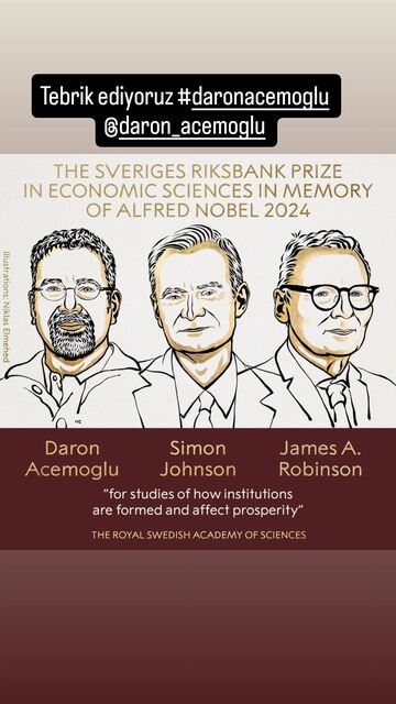 Nobel Ekonomi Ödülü; 'kurumların nasıl oluştuğu ve refahı nasıl etkilediği konusundaki çalışmaları' nedeniyle Daron Acemoğlu, Simon Johnson ve James Robinson'a verildi. Ünlü isimler de sosyal medyadan ülkemizi temsil eden Daron Acemoğlu için tebrik mesajları yayımladı