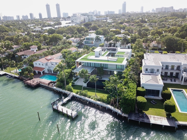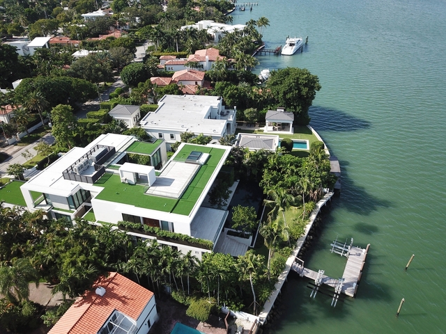 Evin dış mekanında açık mutfak ve Biscayne Körfezi'ne doğru giden 40 metrelik bir cephesi var.