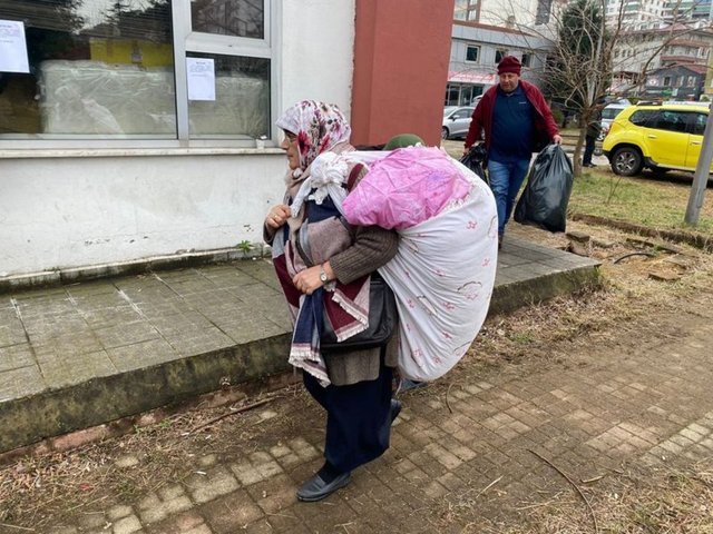 Çuvallara doldurdukları yardım malzemelerini sırtlarında yardım toplama alanlarına taşıyan Karadeniz kadını, fedakarlığı yine duygulandırdı.