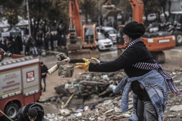 Gaziantep'te yıkılan bir binanın enkazını kaldıran bir kadın.