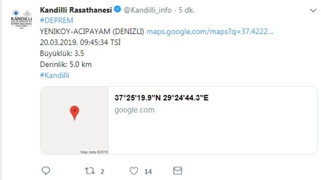 Afet ve Acil Durum Yönetimi Başkanlığından (AFAD) yapılan yazılı açıklamaya göre, saat 09.34'te merkez üssü Acıpayam ilçesi olan 5,5 büyüklüğünde deprem kaydedildi.Sarsıntının yerin 11,36 kilometre derinliğinde meydana geldiği belirlendi.Öte yandan saat 09.38 ve 09.41'de merkez üssü Acıpayam olan 4,8 ve 4,5 olan iki deprem daha meydana geldi.