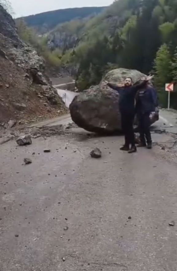 Gümüşhane'de meydana gelen heyelanda yamaçtan kopan dev kaya parçası, Erikbeli Yaylası'na ulaşım sağlanan yola düştü. Ekipler iş makinesiyle kayayı kaldırarak kapanan yolu ulaşıma açarken, yaylaya gitmek üzere yola çıkan arkadaş grubu da dev kaya parçasının altında kalmaktan son anda kurtuldu. Grup, olay sonrasını cep telefonu kamerasıyla kaydetti