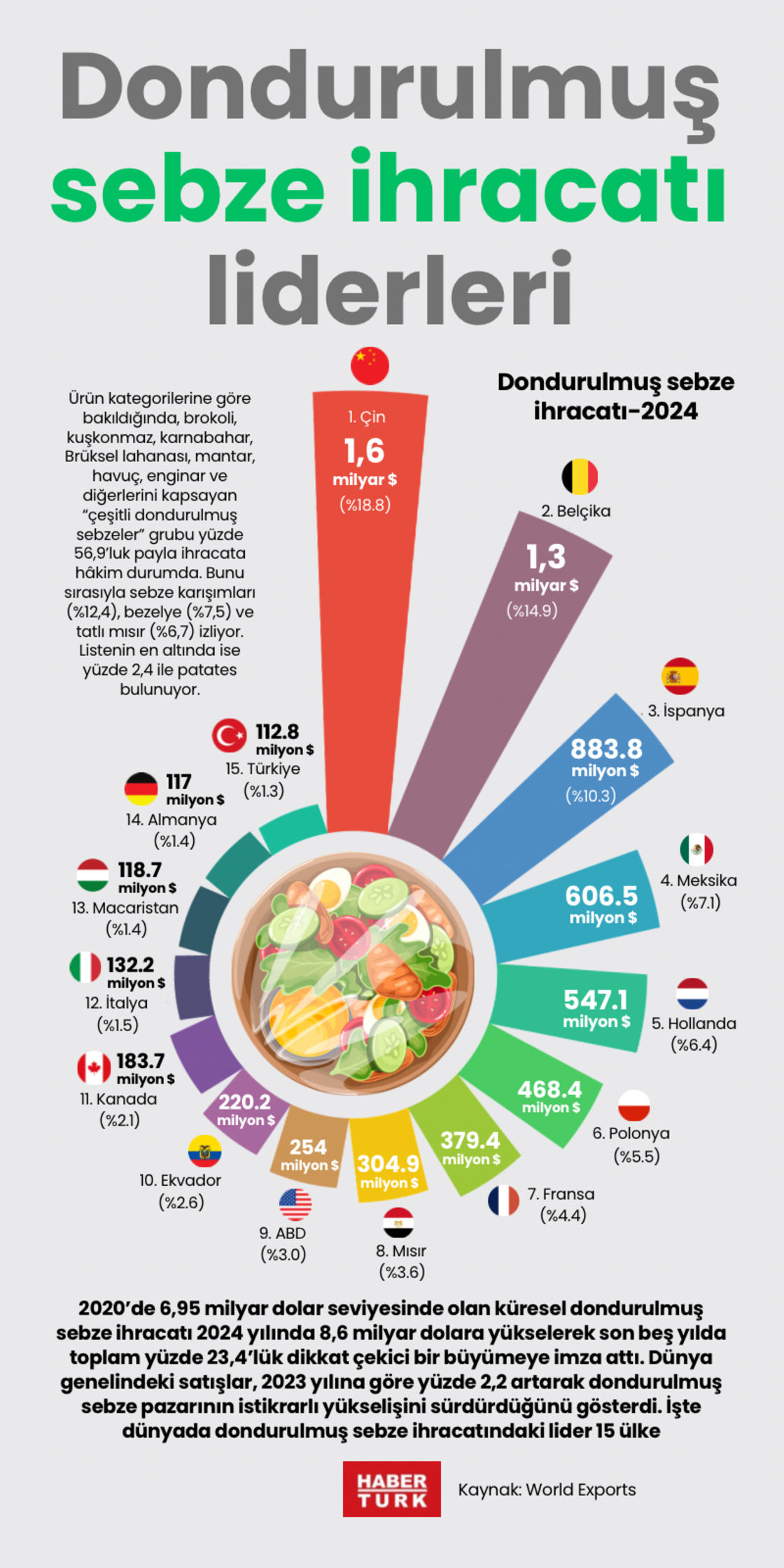 2020'de 6,95 milyar dolar seviyesinde olan küresel dondurulmuş sebze ihracatı 2024 yılında 8,6 milyar dolara yükselerek son beş yılda toplam yüzde 23,4'lük dikkat çekici bir büyümeye imza attı. Dünya genelindeki satışlar, 2023 yılına göre yüzde 2,2 artarak dondurulmuş sebze pazarının istikrarlı yükselişini sürdürdüğünü gösterdi. İşte dünyada dondurulmuş sebze ihracatındaki lider 15 ülke