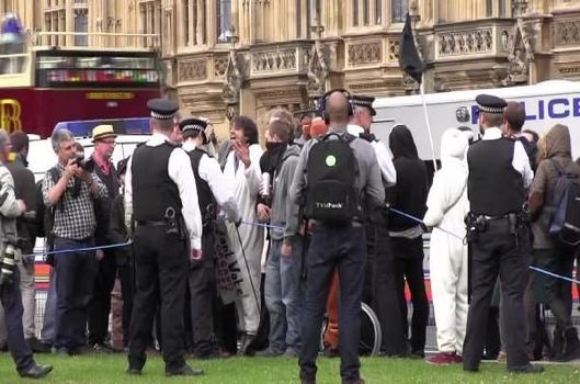 İngiliz polisi gösteri sırasında parlamento önündeki güvenlik önlemlerini arttırdı. Grubun önünde adeta etten duvar ören polisle göstericiler arasında sözlü sataşmalar gece boyunca devam etti.