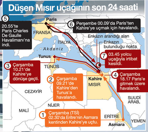 Fransa'nın başkenti Paris’ten Mısır’ın başkenti Kahire’ye giderken önceki gece TSİ 03.30 radardan kaybolan EgyptAir’e ait Airbus A320 tipi yolcu uçağının enkazı, 30 saat süren aramanın ardından bulundu. Mısır ordusundan yapılan açıklamaya göre, 66 yolcu ve mürettebat bulunan uçağın parçaları ile yolcuların bavulları, Mısır’ın liman kenti İskerderiye’nin 290 kilometre kuzeybatısında tespit edildi. Yunanistan Savunma Bakanı Panos Kammenos da 2 yolcu koltuğu, 1 bavul ve bir ceset parçasının bulunduğunu aktardı. Mısır ve Yunanistan arama ekipleri uçağın kara kutusuna odaklanırken, uçağın düştüğünün kesinleşmesi, Paris Charles de Gaulle ve Kahire havalimanlarında haber bekleyen yolcu yakınlarını yıktı. Yolcu yakınları, gözyaşları içinde sorumluların bulunmasını istedi. Uçakta 12 milletten 56 yolcu ve 10 mürettebat bulunuyordu.