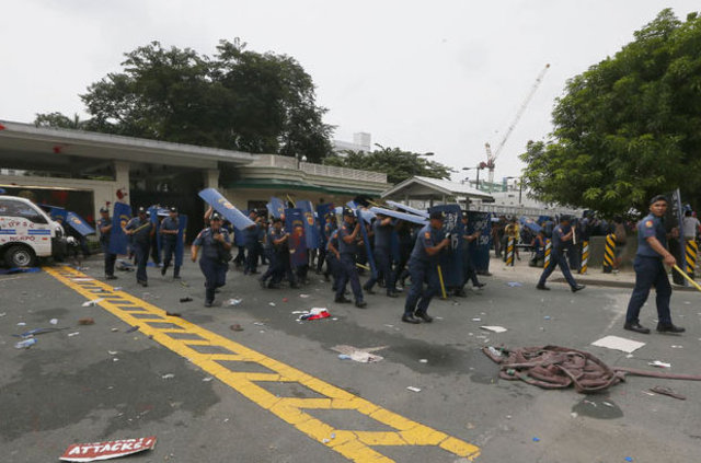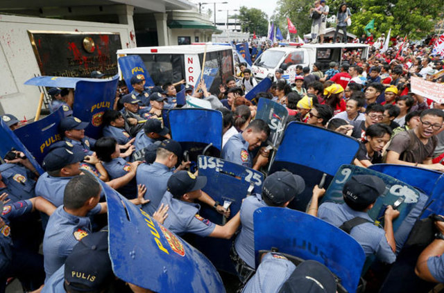 "The InterAksyon" sitesinin, Filipinler Ulusal Azınlıklar Birliği Genel Sekreteri Renato Reyes'a dayandırdığı habere göre, ABD'nin takımadadaki askeri varlığını protesto etmek için büyükelçilik önünde toplanan gruba, göz yaşartıcı gaz ve copla müdahale edildi.