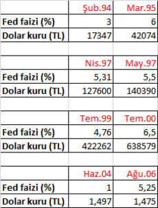 Temmuz 1999-Temmuz 2000 döneminde ise Fed'in 6 faiz artırımı sonrası dolar, içeride 1 yıllık bir süreçte yüzde 51 değer kazandı. Nisan 1997-Mayıs 1997'deki tek faiz artırımı kararının olduğu süreçte dolar Türkiye'de yüzde 10 yükseldi. Şubat 1994-Mart 1995'teki faiz artırımlarında ise dolar, TL karşısında yüzde 142 değer kazandı. Ancak bu dönemde Türkiye ekonomisinin içinde bulunduğu durum ve ardından yaşanan ekonomik kriz de unutulmamalı.
