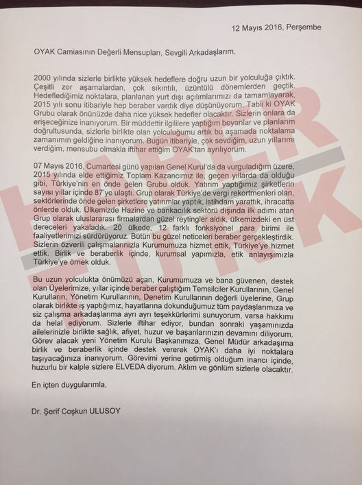Ordu Yardımlaşma Kurumu OYAK’ta Yönetim Kurulu Başkanı emekli Korgeneral Necati Özbahadır’ın sürpriz istifasının ardından 16 yıllık Genel Müdür Coşkun Ulusoy da koltuğu bırakmıştı. Ulusoy, 16 yıldır çalıştığı Oyak'tan ayrılırken bir mesaj gönderdi.