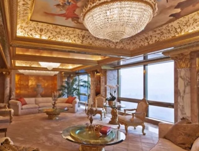 Trump Tower'daki evinde kapılar altın ve elmastan yapılmış. Evin içinde fıskiye, resimlerle süslü bi tavan ve ihtişamlı bir avize bulunuyor.