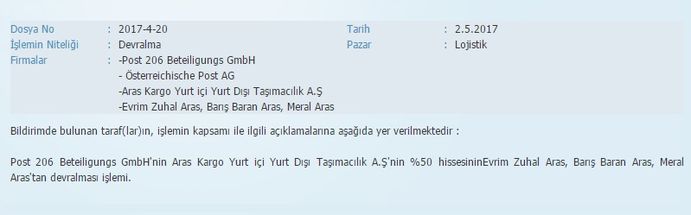 Konu ile ilgili bildirim Rekabet Kurulu'na gönderildi ve Kurul'un internet sitesinde "Post 206 Beteiligungs GmbH'nin Aras Kargo Yurt içi Yurt Dışı Taşımacılık A.Ş'nin %50 hissesinin Evrim Zuhal Aras, Barış Baran Aras, Meral Aras'tan devralması işlemi" ifadesi ile yer aldı.