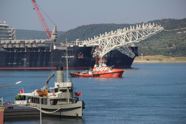 Saat 09.20'de boğazın en dar yeri Çimenlik Kalesi ile Kilitbahir önlerine gelen "Pioneering Spirit"e, Kıyı Emniyeti Genel Müdürlüğüne ait "Kurtarma-4", "Kurtarma-9", "Kurtarma-10" römorkörleri ile "Kıyı Emniyeti-2" ve "Kıyı Emniyeti-4" botları eşlik etti.