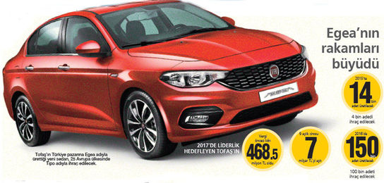 Araştırma ve geliştirme çalışmaları Tofaş’ta tamamen Türk mühendisler tarafından yapılan ve kasım başından bu yana Türkiye’de satılmaya başlanan yeni Fiat Egea’ya Avrupa’dan da beklenenin üzerinde talep geldi. Avrupa pazarında Tipo ismiyle satılacak olan yeni Egea’ya gelen bu yoğun talep hem Fiat’ın hem de üretimi gerçekleştiren Tofaş’ın planlarını değiştirmesine neden oldu. Önce otomobilin Avrupa lansmanının mart ayında kapılarını açacak olan Cenevre Otomobil Fuarı’nda yapılacağını açıklayan Fiat, gelen yoğun talep üzerine, Cenevre’yi beklemeyip tanıtımın 3 ay öne çekilerek bu ay içinde İtalya’da yapılmasına karar verdi.