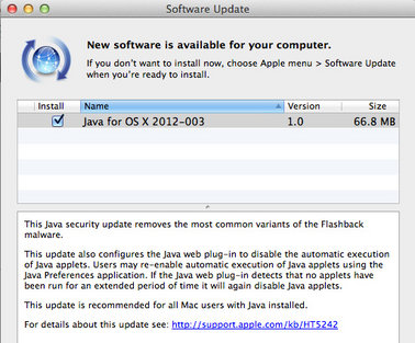 Apple'ın ilk yayınladığı yama OS X'teki Java'yı 1.6.0_31'e yükseltmek amaçlı olarak görünse de son yayınlanan "Java for OS X 2012-003" güncellemesinin açıklamasında esas hedef itiraf ediliyor. Güncellemenin açıklamasında "Bu Java güvenlik güncellemesi Flashback isimli zararlı yazılımın bilinen pek çok varyasyonunu sistemden siler" yazıyor.