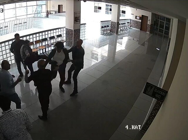 Ayrıca kovalamacının devam ettiği saldırı anında kaçarak başka bir koridora giren Pektaş'ın yüzüne gelen yumruk ile yere düştüğü, meslektaşı ile başka bir şahıs tarafından yerde darp edildiği de kameraya yansıyor.