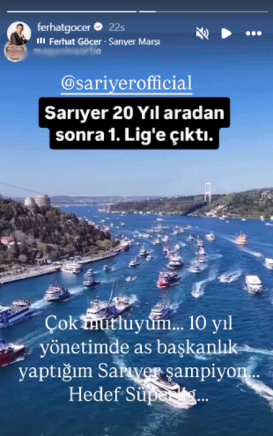 Şarkıcı Ferhat Göçer de o anları sosyal medya hesabından paylaşarak Sarıyer’i tebrik etti. Göçer, paylaşımında şu ifadeleri kullandı; "Çok mutluyum. 10 yıl yönetiminde asbaşkanlık yaptığım Sarıyer şampiyon. Hedef Süper Lig"